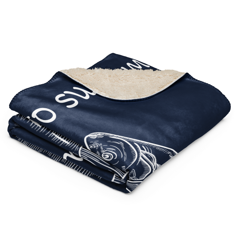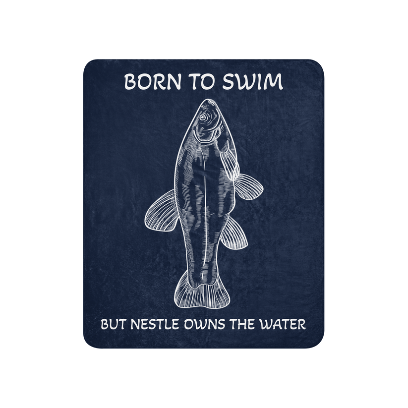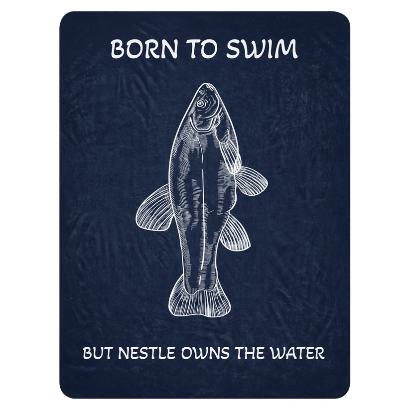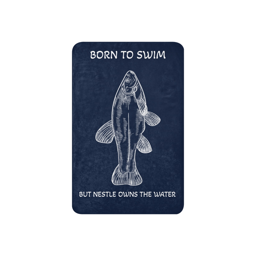 A thick but lightweight sherpa blanket featuring a sketch of a fish, along with the words Born to Swim, But Nestle Owns The Water. Private property is pretty fucked up. The world is everyone's, including all of the bugs, fish, and birds that we keep trying to build dams and fences around.