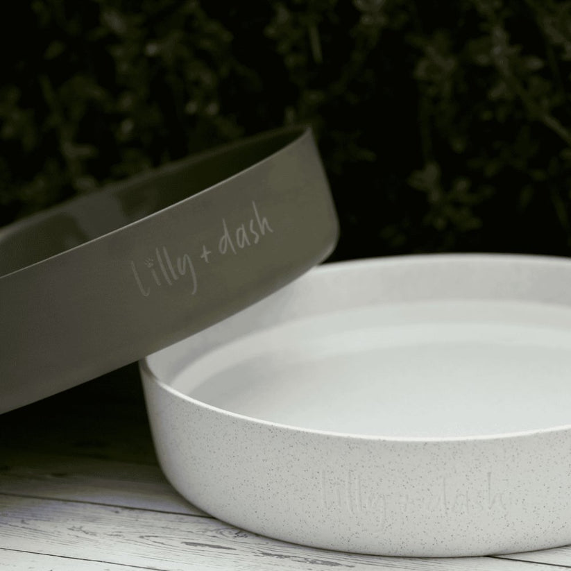 Our ceramic outdoor water bowl features an on trend raw exterior with a hand glazed glossed interior for easy cleaning and functionality. Our design is complete with its subtle debossed Lilly + Dash logo. Ceramic is durable and naturally cool which helps keep your pet's water fresher for longer. The generous size of this bowl will ensure your pet has an outdoor water source that will last over a long period of time. The Lilly + Dash outdoor water bowl can also be used as a bird bath or is even the perfect decorative piece for your outdoor space.